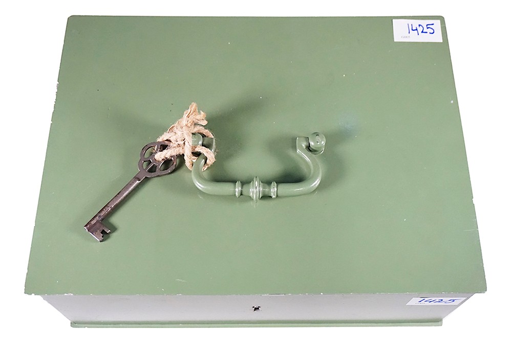Groene gereedschapskist met honderden stedenpenningen; ook enig zilver.