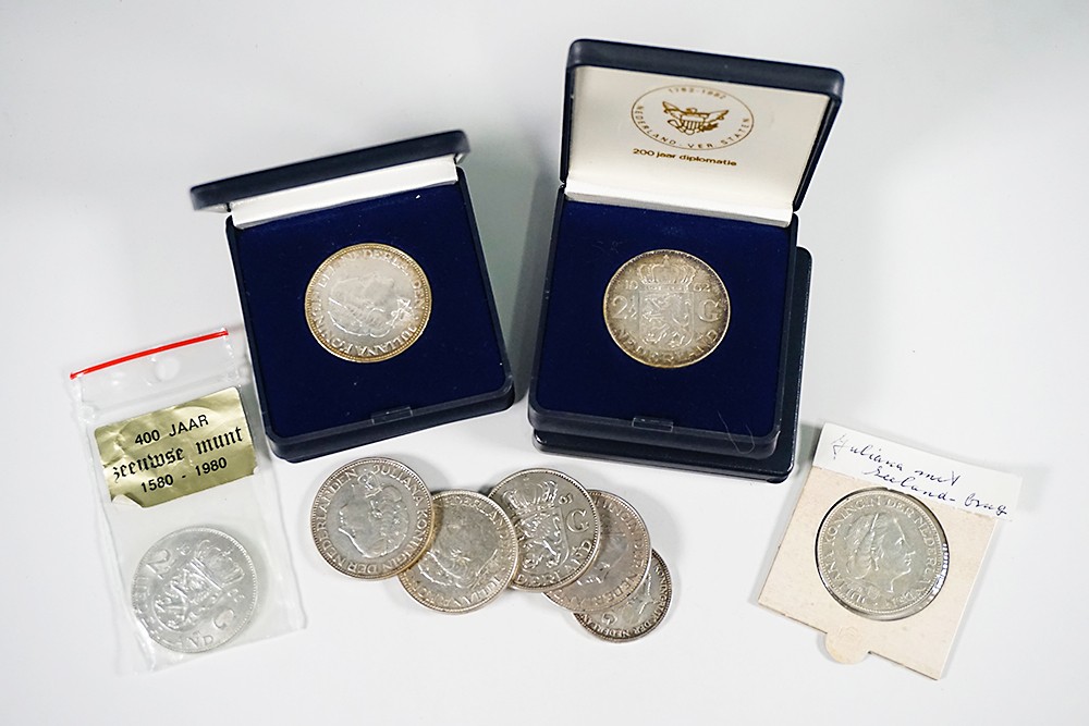 Bakje (11) zilveren rijksdaalders Juliana met een ‘klop’ (10x) en een zilveren Wilhelminagulden.