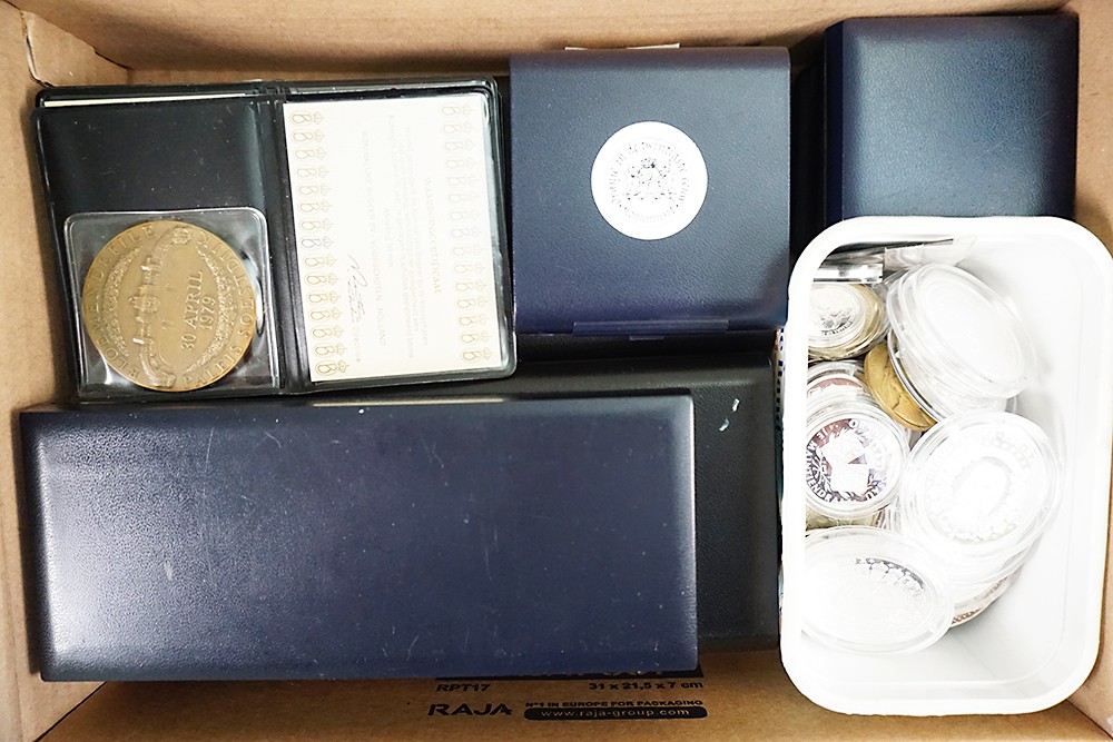 Doos vol moderne penningen betreffende het Oranjehuis. Veel zilver.