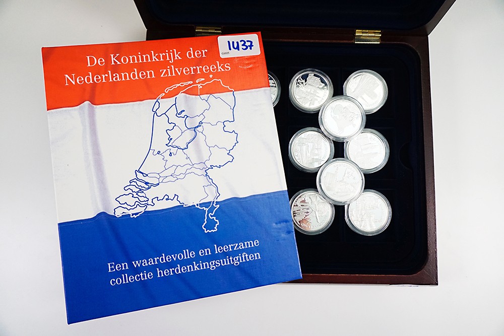 Houten doos met 26 zilveren penningen; thema: “De Koninkrijk der Nederlanden Zilverreeks”. Inclusief bijbehorend boekje. Uitg. Het Nederlandsche Muntenhuis. Netto zilver: 601 gram.