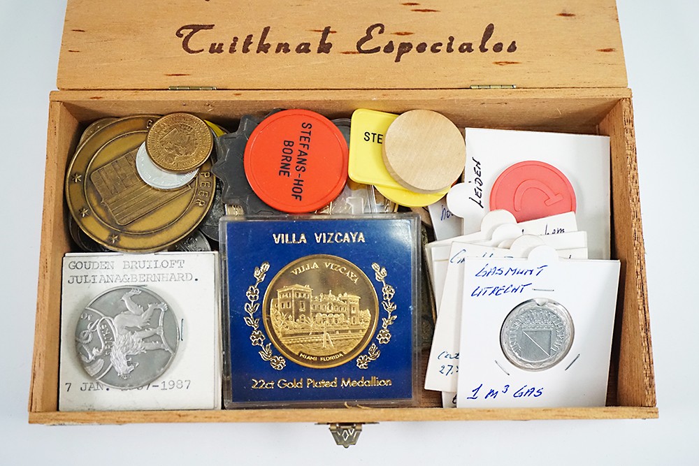 Sigarenkistje (53) diverse penningen, w.o. gaspenningen.
