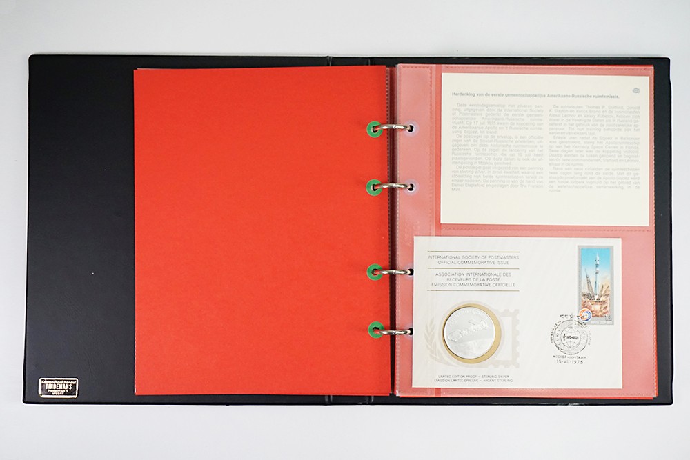 Album met 13 stuks Sterlingzilveren penningen op enveloppe met postzegel. Uitgifte van International Society of Postmasters.