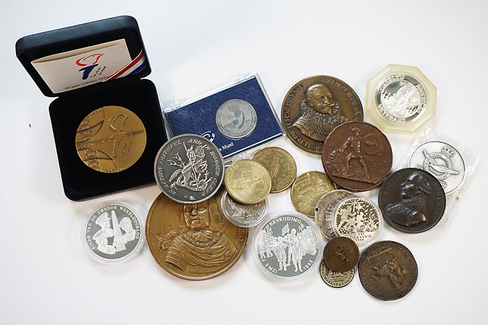 Blikje (20) penningen met een ‘militaria’- tintje.
