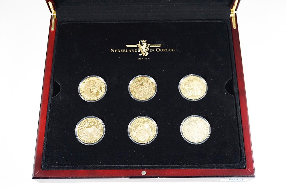 Grote houten cassette met 12 verguld bronzen penningen “Nederland in Oorlog 1940-1945. Uitgifte Het Nederlandsche Muntenhuis. (Uitg. prijs per penning € 29,95). Incl. certificaten.