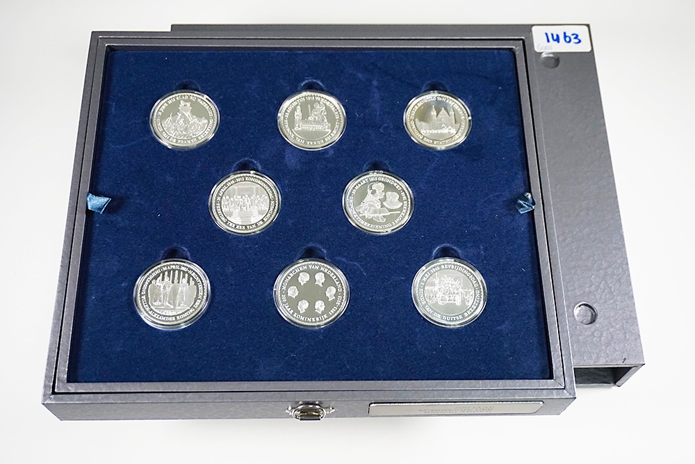 Staalgrijze cassette met 12 zilveren penningen “200 Jaar Koninkrijk”. Elke penning 1 Troy Ounce puur zilver. Incl. certificaten. Uitg. prijs (KNM) € 809,40.