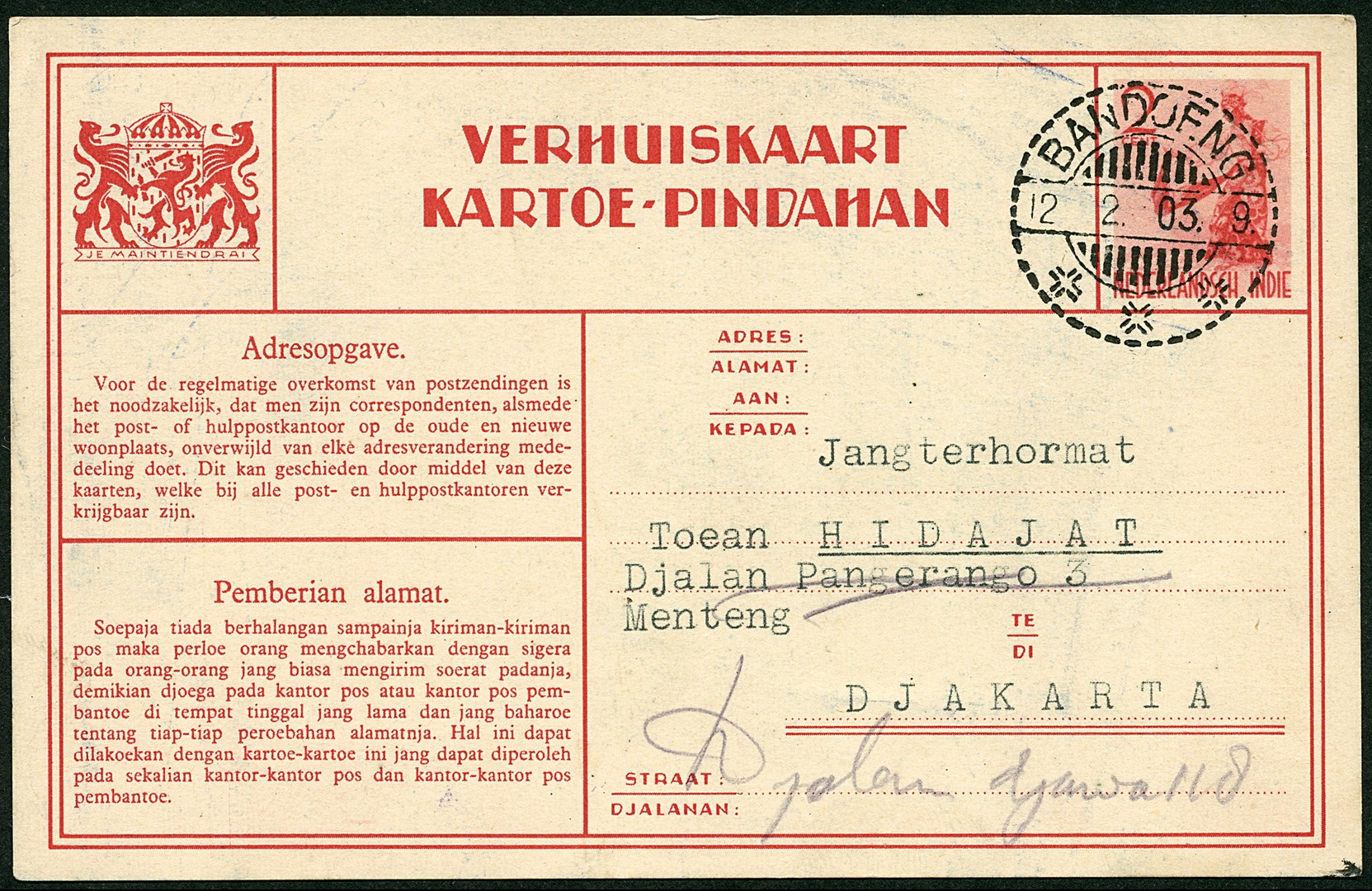Change of Address Card of 2 cent Bu.J7 from Bandoeng 12.2.03 to Djakarta
