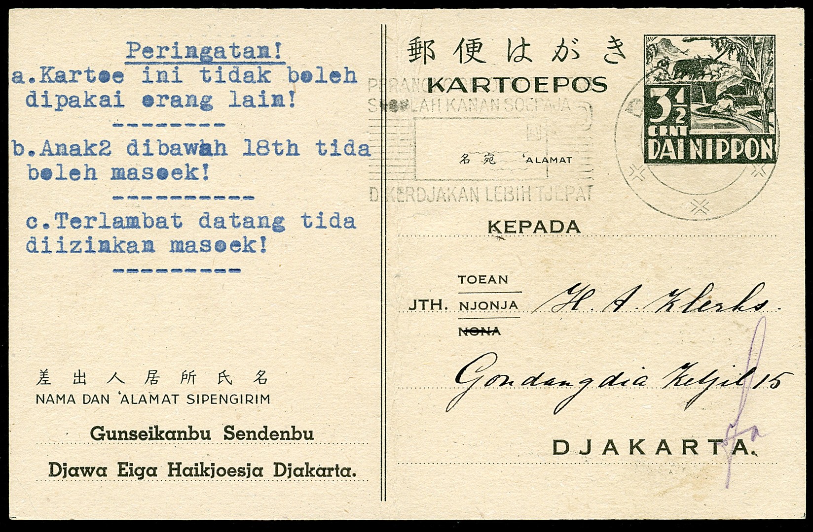 3½ Cent postcard Bu.J11 from Djakarta 15.8.04 to be used as an entrance ticket for cinema to see a movie 'Seiki no Seiten' on 17.8.04. The blue type notes mean a. do not give it to another person, b. children younger than 18 not allowed and c. if you arrive too late, you cannot enter anymore. A most unusual document!