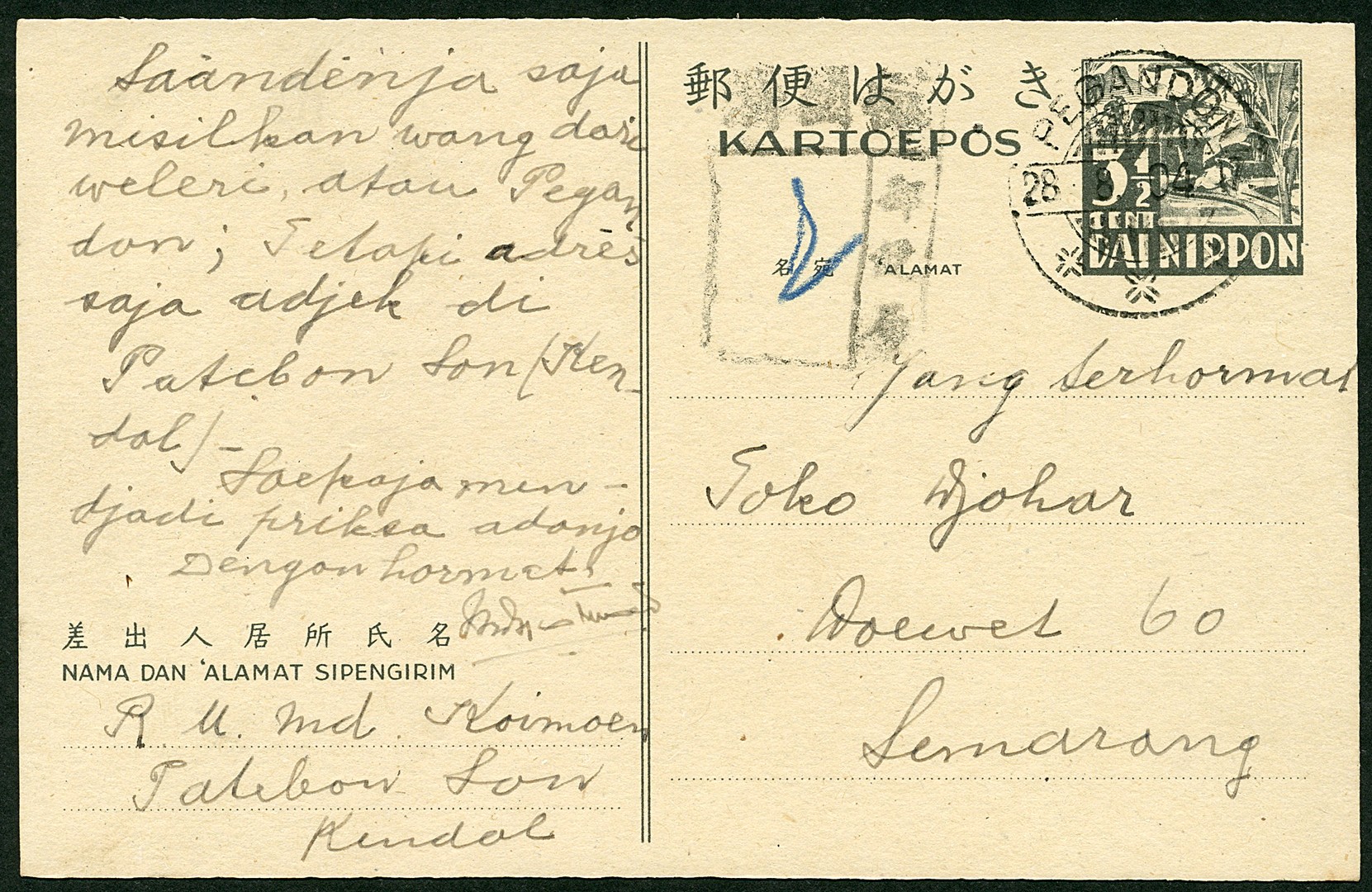 Rare postmarks on 3½ cent postcards from PEGANDON 28.8.04 (type 010), PETJANGAÄN 16.10.04 (type 010) and TJILATJAP / S 1 17.5.03 (type 030) (vNV. R, R and R)