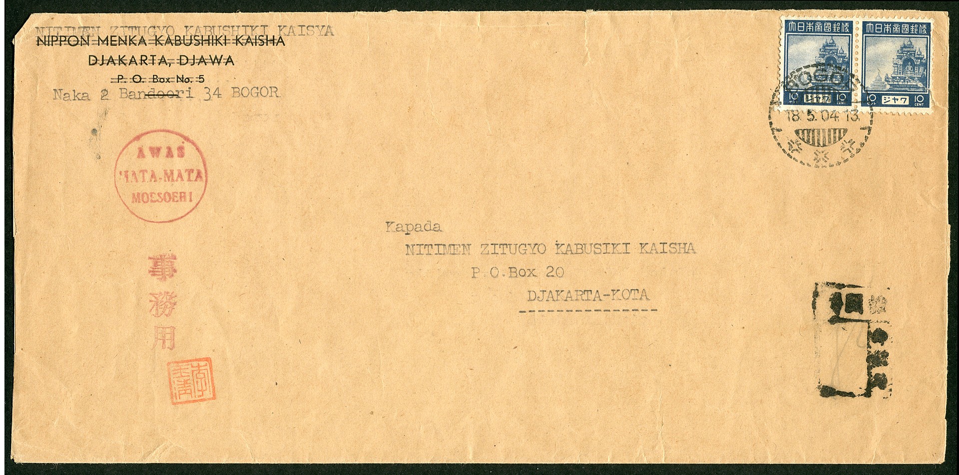 Propaganda cachet 'Awas mata-mata moesoeh!' type 464 on a cover (3 sides opened) bearing 10 cent no. 007 (2x) from Bogor 18.5.04 to Djakartakota