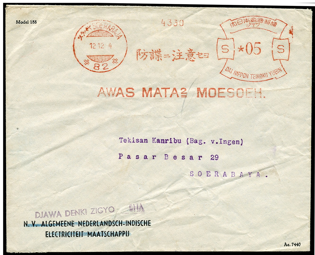 Meter franking Soerabaja 82 'AWAS MATA2 MOESOEH.' type M12 on a cover locally sent on 12.12.4. The only example recorded so far (vNV. RRR, illustrated on page 247)