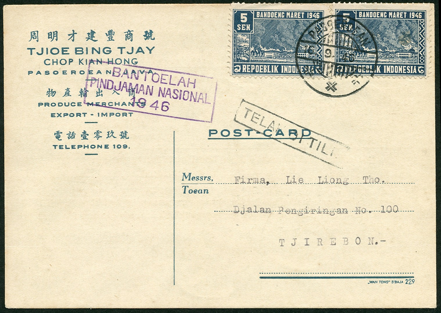 5 Sen no. 029 in pair on locally printed postcard from Pasoeroean 16.9.46 (type 011, not recorded from Pasoeroean) to Tjirebon. Propaganda cachet 'Bantoelah...' type 483 and censor Bu.RC1b