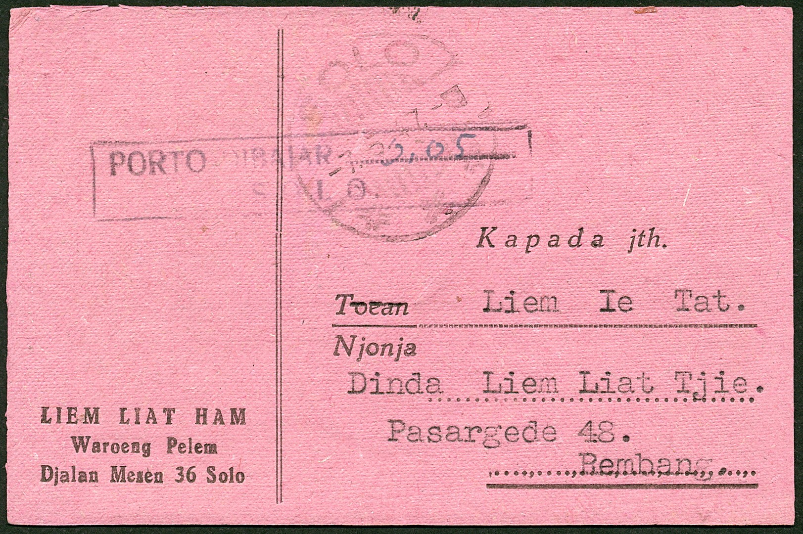 Locally printed pink postcard showing not recorded type framed 'PORTO DIBAJAR / SOLO' with written '0,05' from Solo 7.5.47 to Rembang