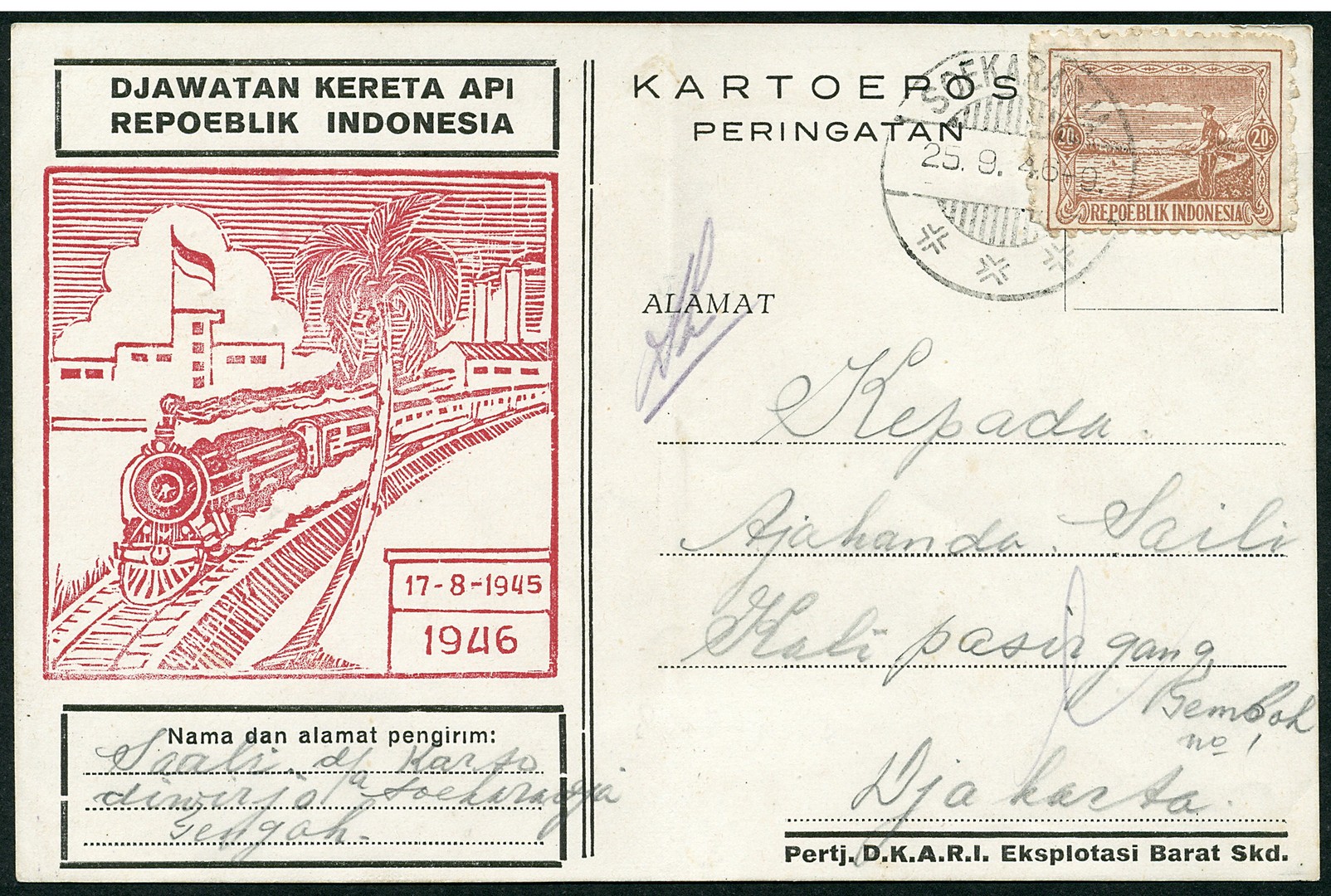 20 Sen no. 026 on special postcard commemorating the 'Djawatan Kereta Api / Repoeblik Indonesia' (Indonesian Railways) from Soekaradja 25.9.4.6.-9 to Djakarta
