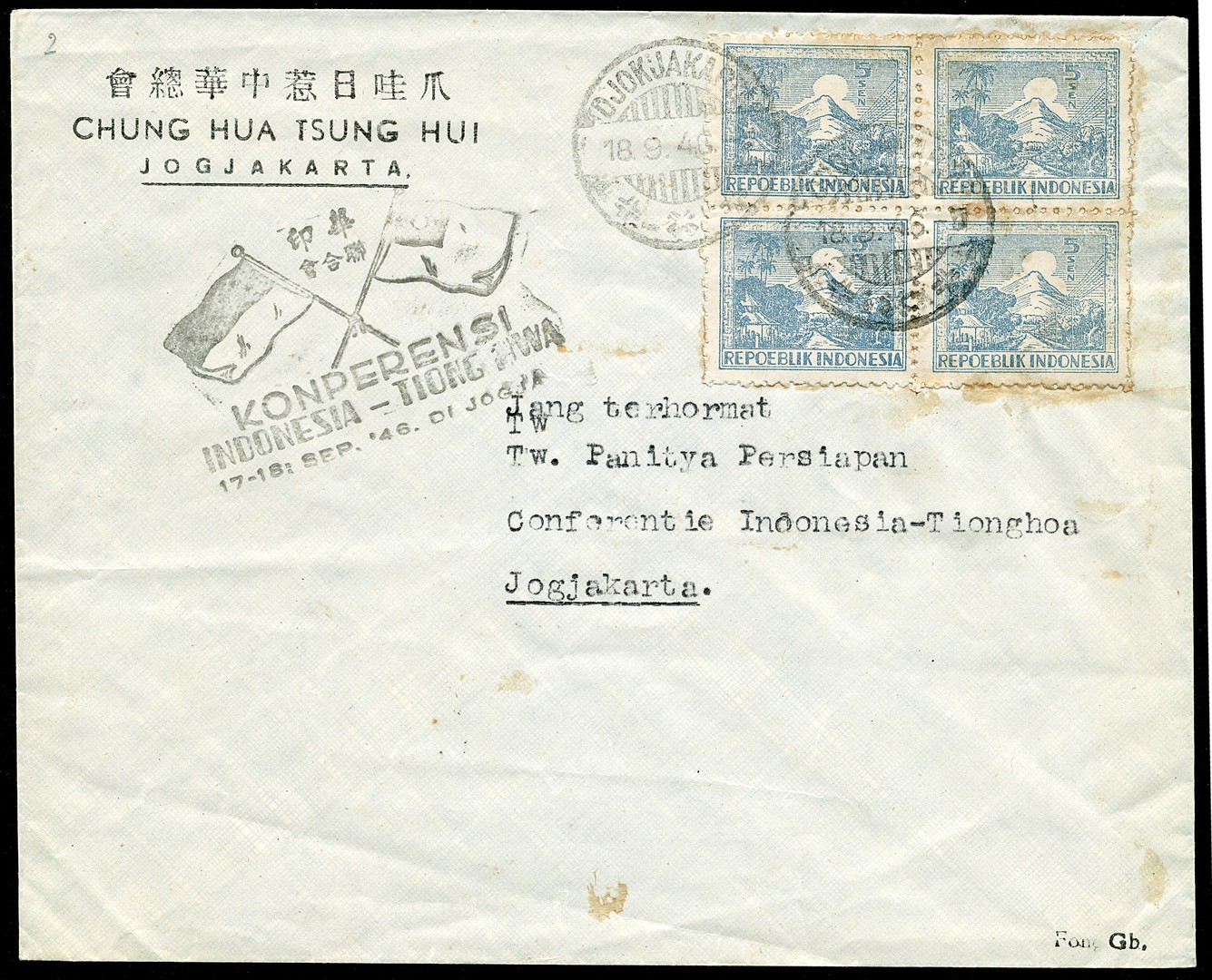 5 Sen no. 025 in block of four (brown spots are not rust but glue) on cover locally sent to one of the conference participants in Djokjakarta 18.9.4.6, showing the propaganda cachet 'Konperensi / Indonesia - Tiong Hwa' (Indonesia - China Conference) type 486