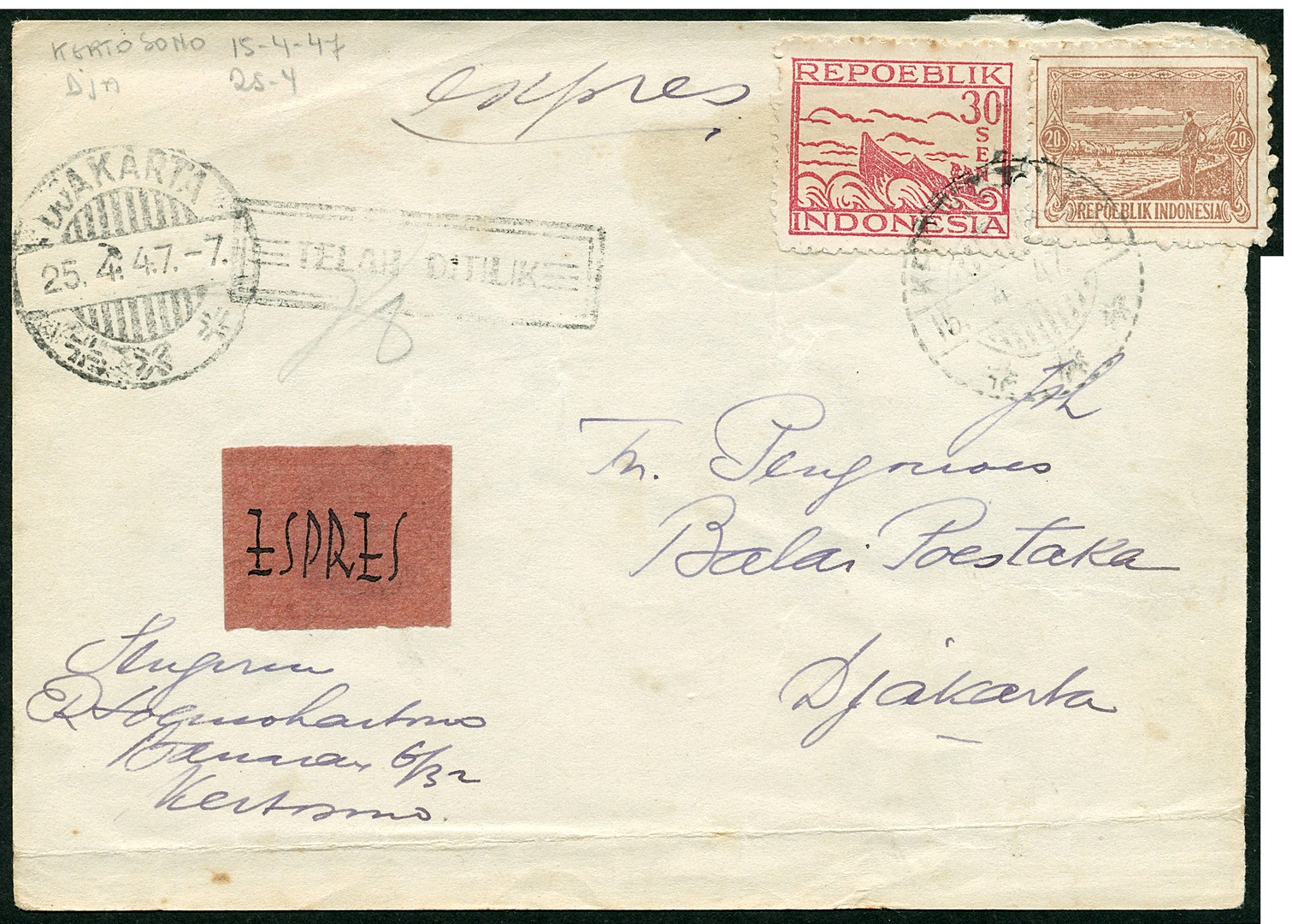 20 Sen and 30 sen nos. 026-027 on homemade postcard from Kertosono 15.4.47.9 by express (improvised label) to Djakarta 25.4.4.7.-7. Censor Bu.RC1c