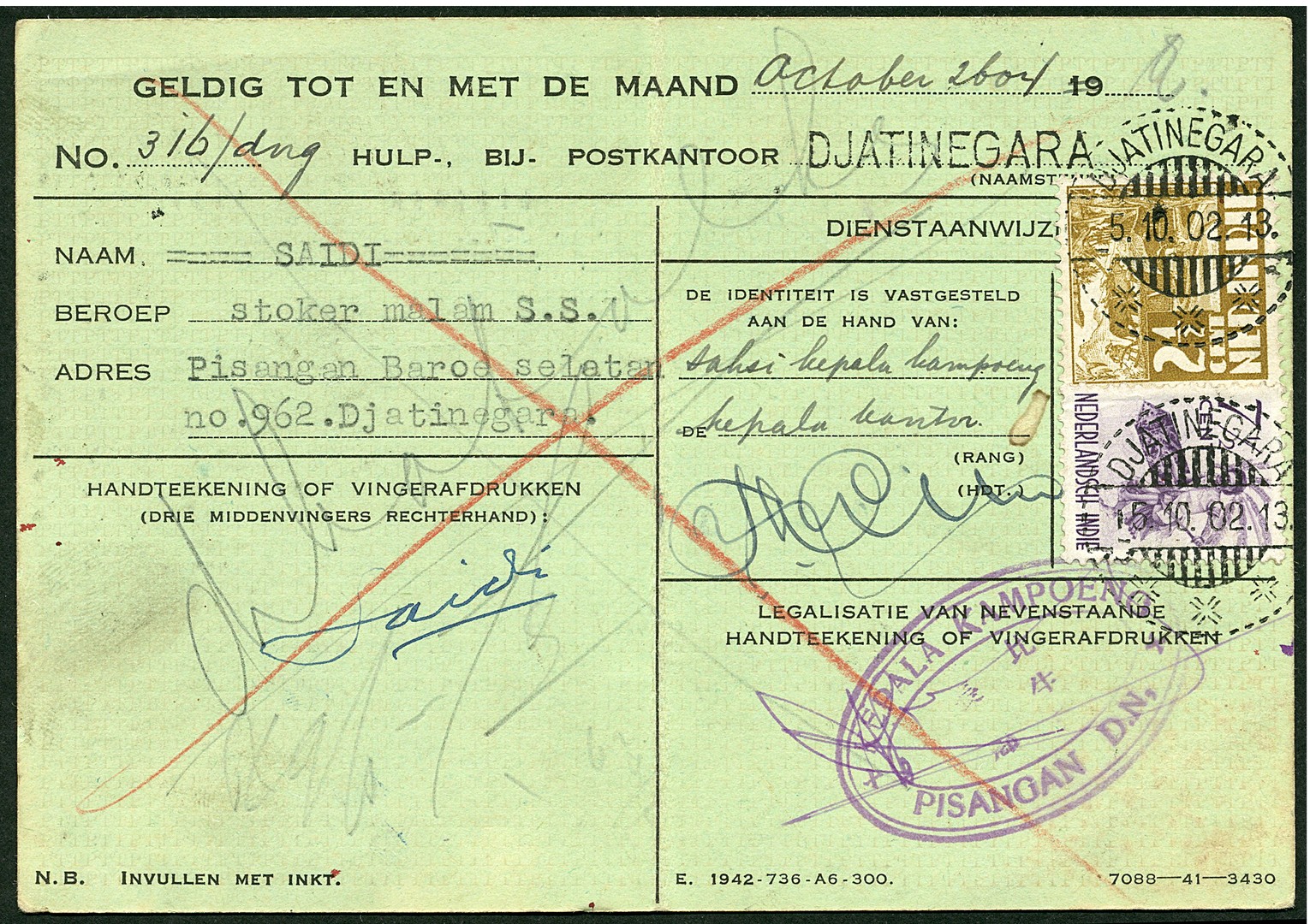 2½ Cent Kreisler no. 17b and 7½ cent dancer no. 71 on Identity card Bu.JF30, cancelled Djatinegara 5.10.02