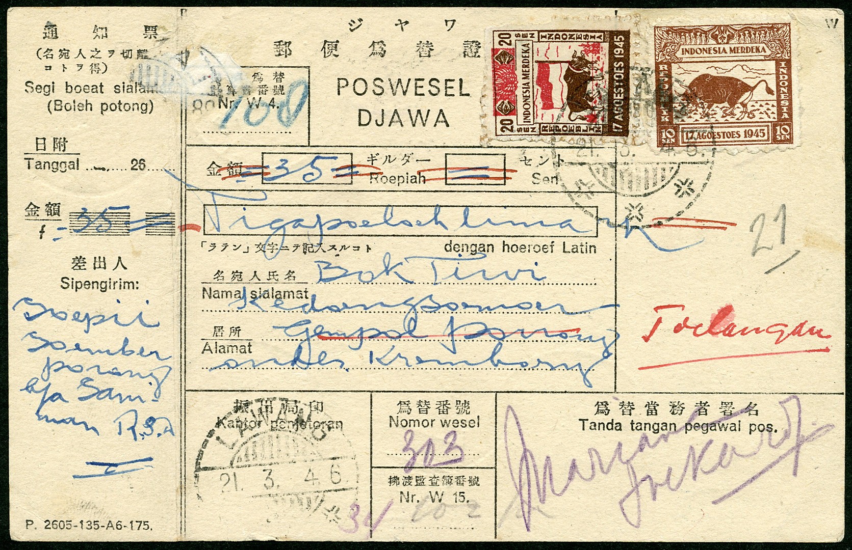 10 Sen and 20 sen nos. 023-024 on complete M.O. Bu.RF3c from Lawang 21.3.4.6. to Porrong 23.3.6.9 but redirected to Toelangan (red pencil) 26.3.46.13