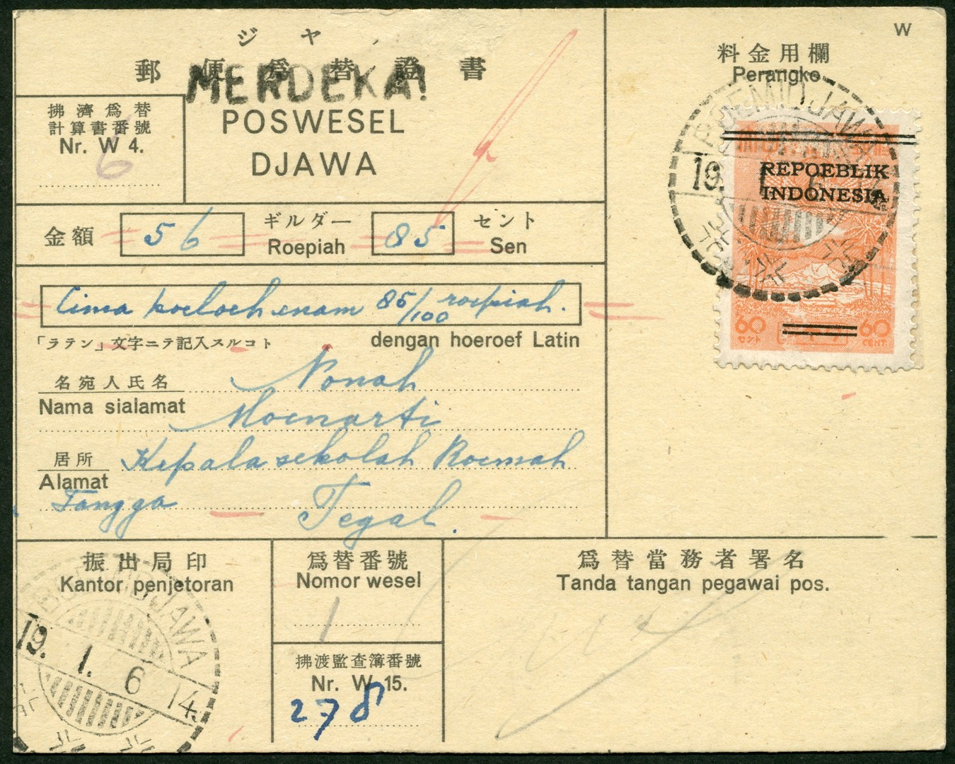 60 Cent with machine overprint no. 015 on M.O. Bu.RF4 showing propaganda cachet 'MERDEKA!' from the very small sub-post office of BOEMIDJAWA 19.1.6.14 to Tegal 22.1.46.10. Scarce form and rare postmark (vNV.R)