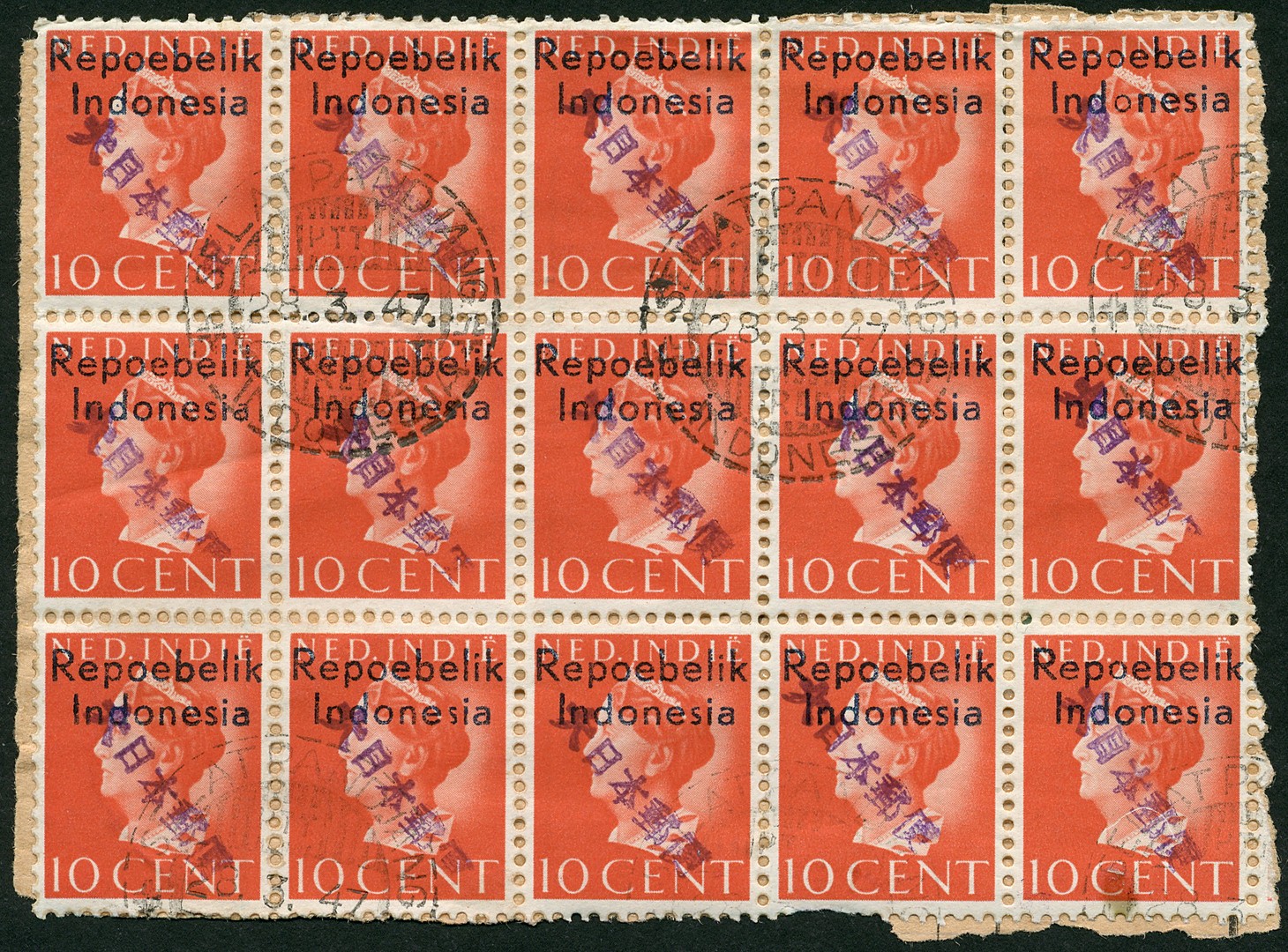 10 Cent van Konijnenburg with violet Japanese overprint 87v and machine overprint 'Repoebelik / Indonesia', no. 0114/I in block of fifteen on paper (1 damaged), cancelled Selatpandjang 28.3.47 (type 250)