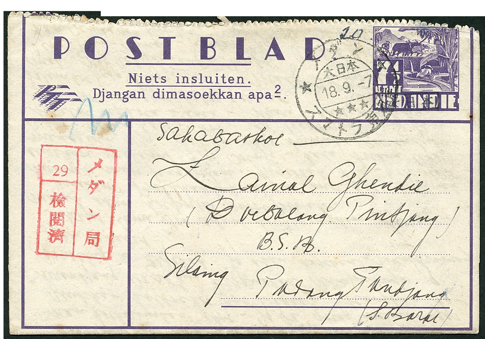 7½ Cent letter sheet with black framed Dai Ni Hon overprint Bu.167a from Medan 18.9.-7 (type 200) to Padang Pandjang. Sewing machine censor at the top (3 mm missing) and censor Bu.Jc14b. Ex Bonn