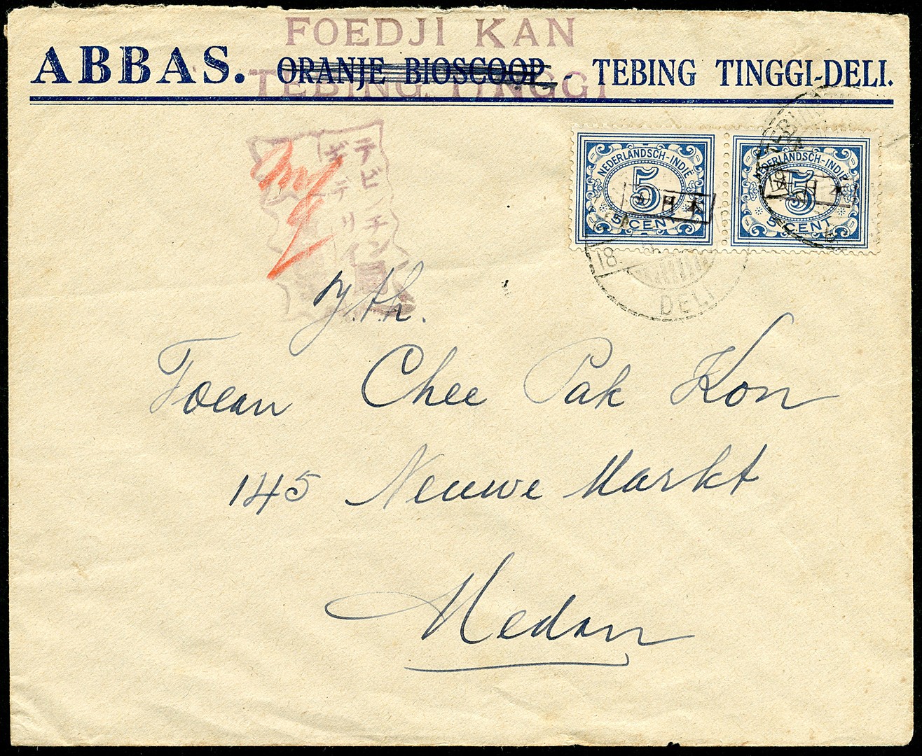 5 Cent numeral with black framed Dai Ni Hon overprint no. 821z-42 in pair on 'Foedji Kan' cover from Tebingtinggi- / Deli 18.5.11.16 to Medan. Censor Vr.312 from Tebingtinggideli