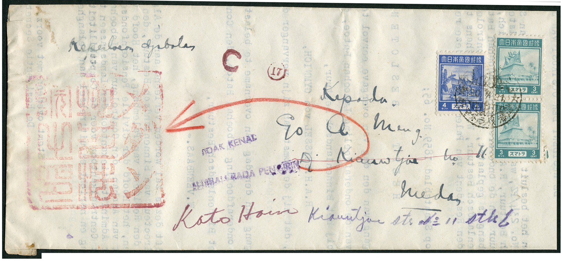 Definitives 3 cent no. 003 in pair and 4 cent no. 005 on envelope of recycled paper locally sent Medan 20.7.21 and returned to sender. Censor 'C' Bu.JC16 and number 17