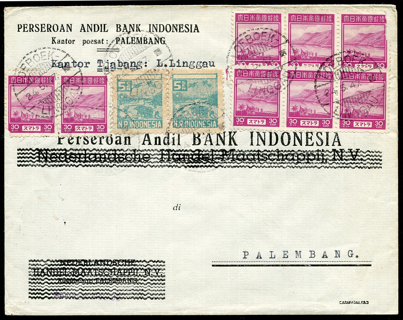 30 Cent definitive occupation issue for Sumatra no. 94 (8x of which 2 with faults) and 5 sen no. 0130 in pair on cover from Loeboek- / Linggau 24.5.47 to Palembang 26.-5.47