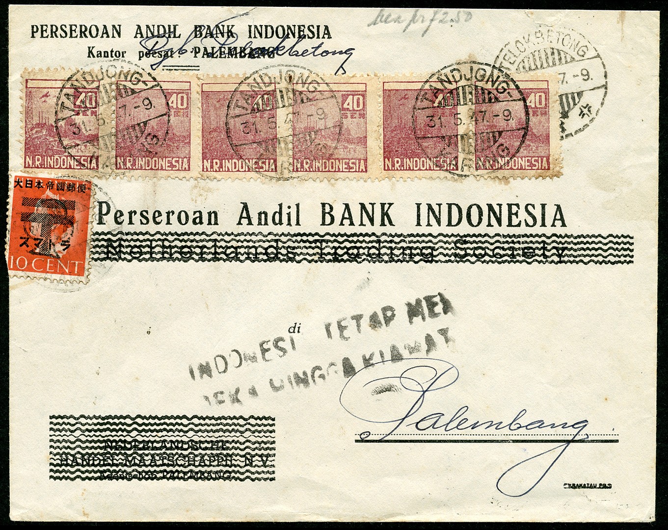 40 Sen no. 0133 (3 pairs) and 10 cent van Konijnenburg with machine T and Indonesian ORI overprints no. 71z-92z-43' (corner missing) on cover originally from Telokbetong 30.5.47.-9 via Tandjong- / Karang 31.5.47.-9 to Palembang -2.-6.4.7. On top of the cover is written 'bea pr ƒ 2.50', perhaps done at Telokbetong, while in Tandjongkarang the stamps were affixed. Propaganda cachet type 481. Unusual