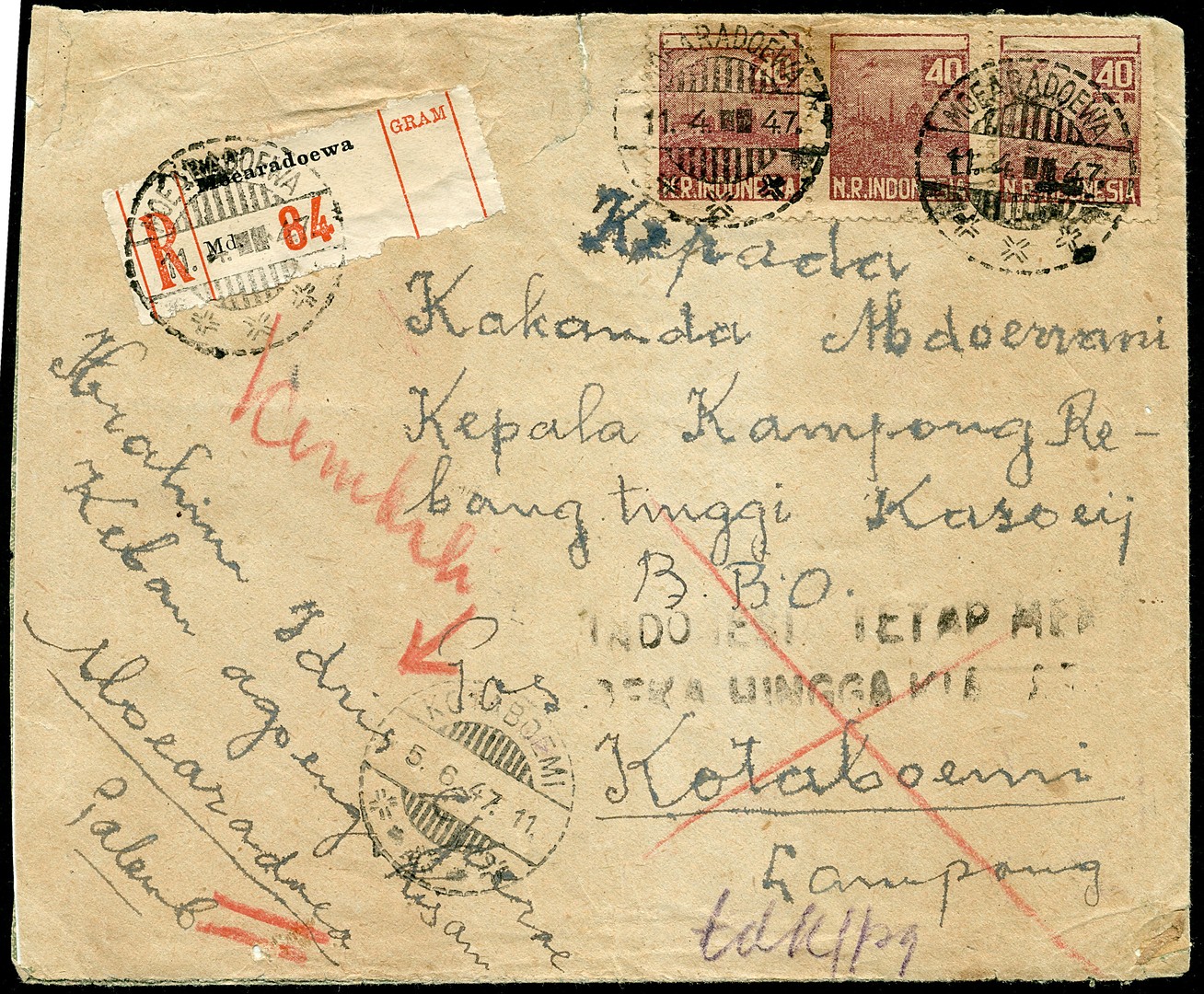 40 Sen no. 0133 in strip of three on the front and strip of seven on the back on registered cover from Moearadoewa 11.4.47 via Martapoera- / Zuidsumatra 20.10.4.7 to Kotaboemi 29.4.47.-9 and returned to sender. Propaganda cachet type 481