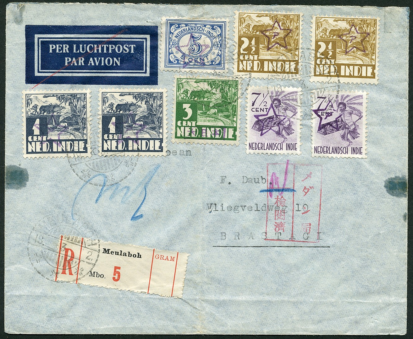 Atjeh star overprints nos. 11v-15b (2x), 11v-17b (2x), 11v-71 (2x), 12v-42 and 3 cent Kreisler with violet Dai Ni Hon overprint no. 821v-18b, on registered cover from Meulaboh 18.3.2. to Brastagi 18.3.9.13. Censor Bu.14a from Medan