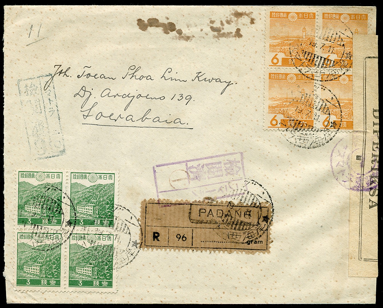 3 Sen and 6 sen Japanese stamps nos. J5 and J7 in blocks of four on a registered cover from Padang 19.7.11 to Soerabaja 2.8.0.4.-9. R-label Bu. type 7b, censors Bu.JC15 2 types in blue and violet, JC17, censor label Bu.JCS8