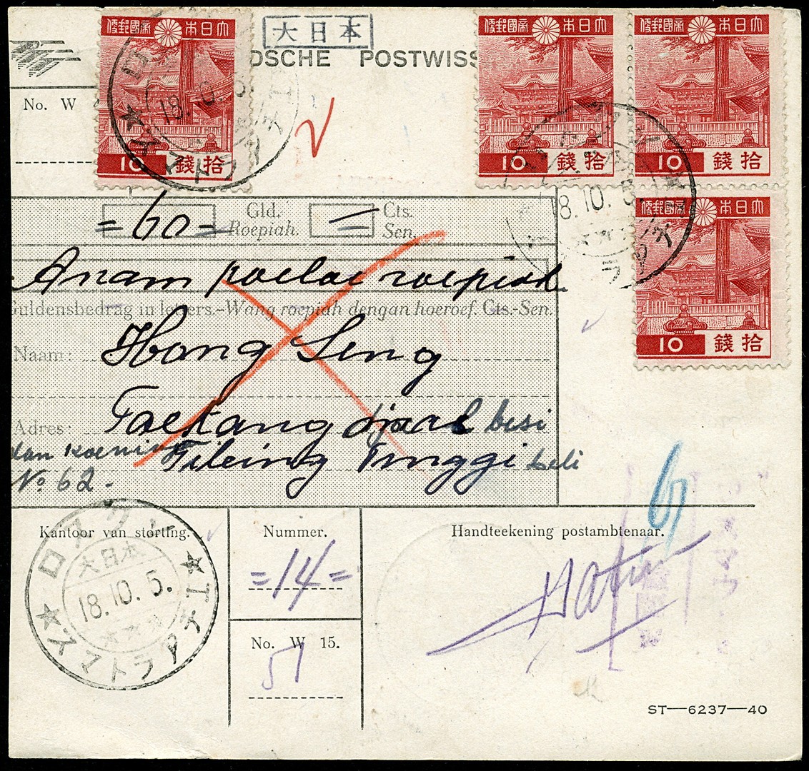 Atjeh. 5 Sen Admiral Togo no. J3 on 18.10.6, 10 sen no. J10 (4x) on 18.10.6, 10 cent van Konijnenburg with machine T-overprint no. 92z-43'bg (2x) on 19.5.9, and 10 cent Malaya no. M14 on 18.10.5, on 4 M.O.'s (2 with 11v, 2 with 82z) all from Lhosoekon