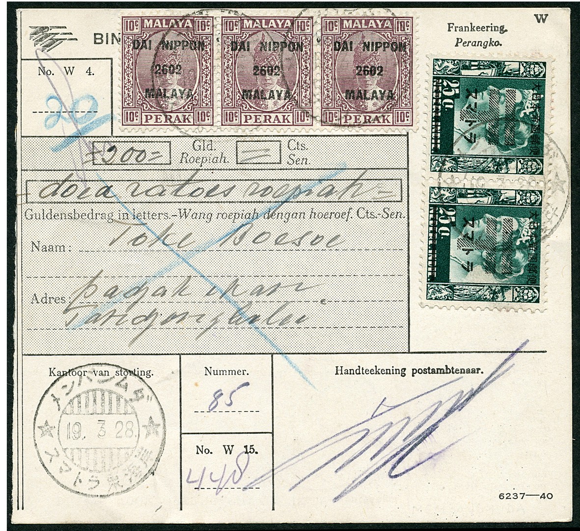 East Coast. 25 Cent Kreisler with machine T-overprint no. 92z-28b in pair and 10 cent Malaya no. M14 in strip of three on M.O. Bu.JF1a from Membangmoeda 19.3.28 to Tandjongbalei 19.3.29. Nice franking!