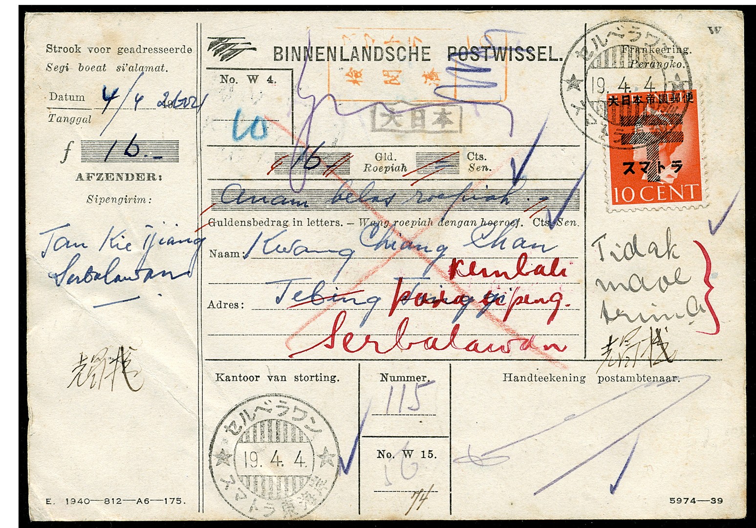 East Coast. 10 Cent van Konijnenburg with machine T-overprint no. 92z-43'bg on complete M.O. Bu.JF1a showing framed Dai Ni Hon overprint 833z from Serbalawan 19.4.4 to Tebingtinggi Deli 19.4.-6 however on 19.4.12 returned because the addressee did not want to receive it (with pencil written 'Tidak maoe trima'). Censor Bu.JC15 in orange
