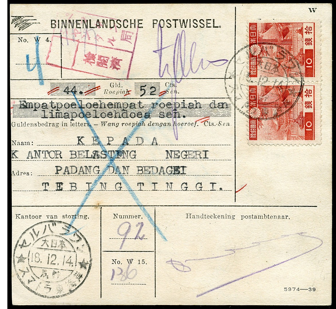 East Coast. 10 Sen no. J10 single and in pair on two M.O.'s from Prapat 18.12.20 and Serbalawan 18.12.14. Censors Bu.JC14a