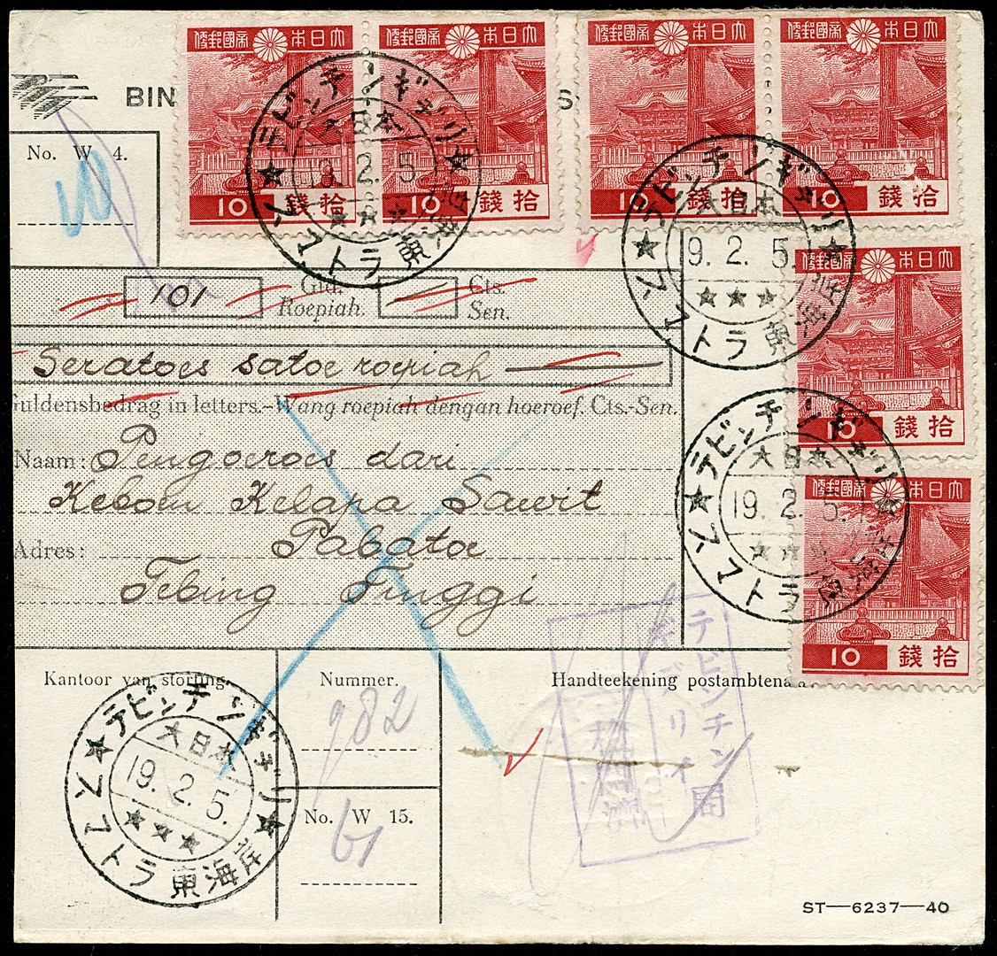 East Coast. 10 Sen no. J10 (6x) on 19.2.5 and 80 cent van Konijnenburg no. 92z-53k on 19.3.23 on two M.O.'s both from Tebingtinggi Deli with different postmarks (type 200 and 202) and censors Bu.JC14a and 15