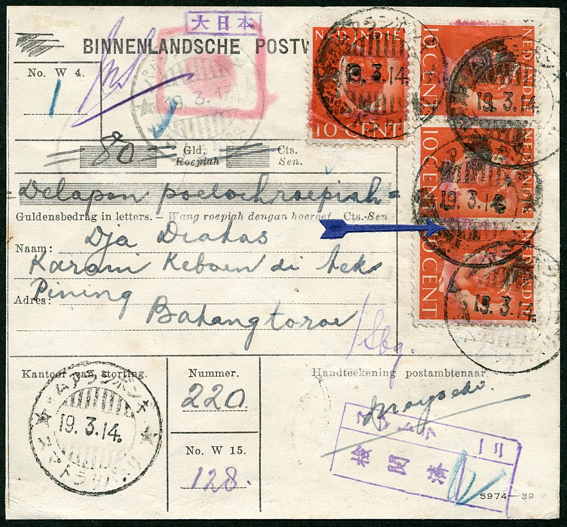 Tapanoeli. 10 Cent van Konijnenburg with Hinomaru overprint nos. 22r-43'bg (3x) and 43" (1x) on M.O. Bu.JF1a showing Hinomaru overprint 22r and framed Dai Ni Hon overprint 82v from Moearasipongi 19.3.14 to Batangtaro 19.3.19. Censor Bu.JC15