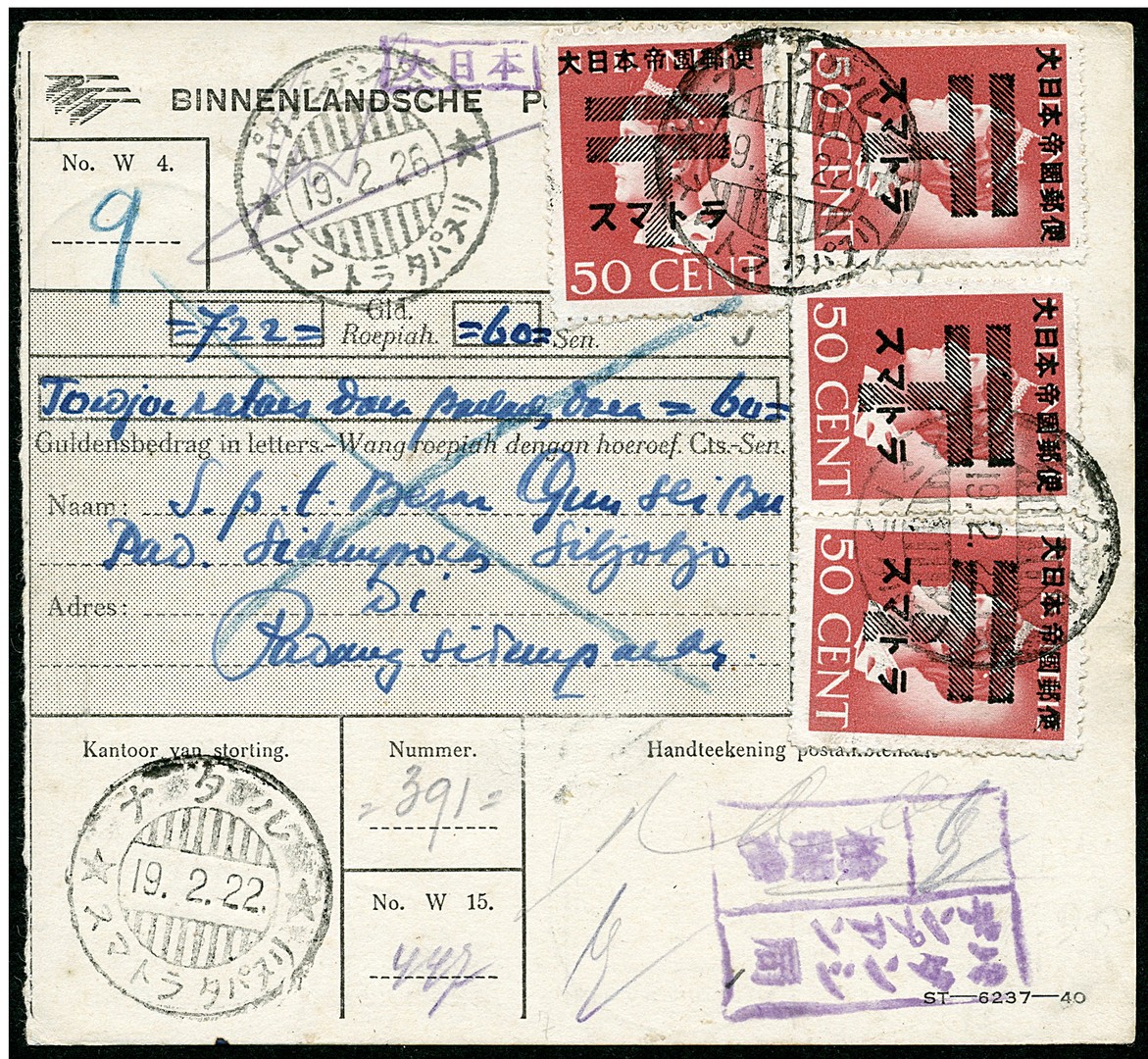 Tapanoeli. 50 Cent van Konijnenburg with machine T-overprint no. 92z-51k (4x) on M.O. Bu.JF1a showing framed Dai Ni Hon overprint 82v from Natal 19.2.22 to Padangsidempoean 19.2.26 where it was also censored Vr.312