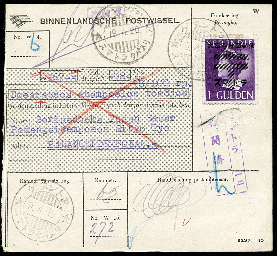 Tapanoeli. Nineteen M.O.s with a nice variety of frankings, overprints, postmarks (like from the small sub-post office of Telokdalem) and censor markings
