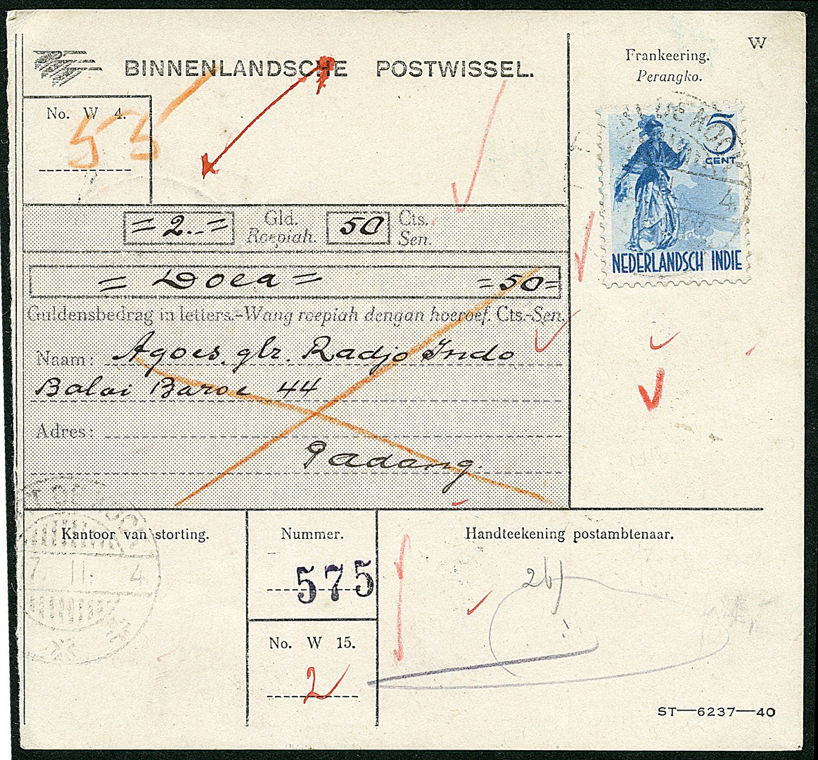 West Coast. 5 Cent dancer without overprint no. 42 on M.O. Bu.JF1a from Fort de Kock 17.11.4 to Padang 17.11.5 (backstamped with roller cancellation type 081 with Showa date)