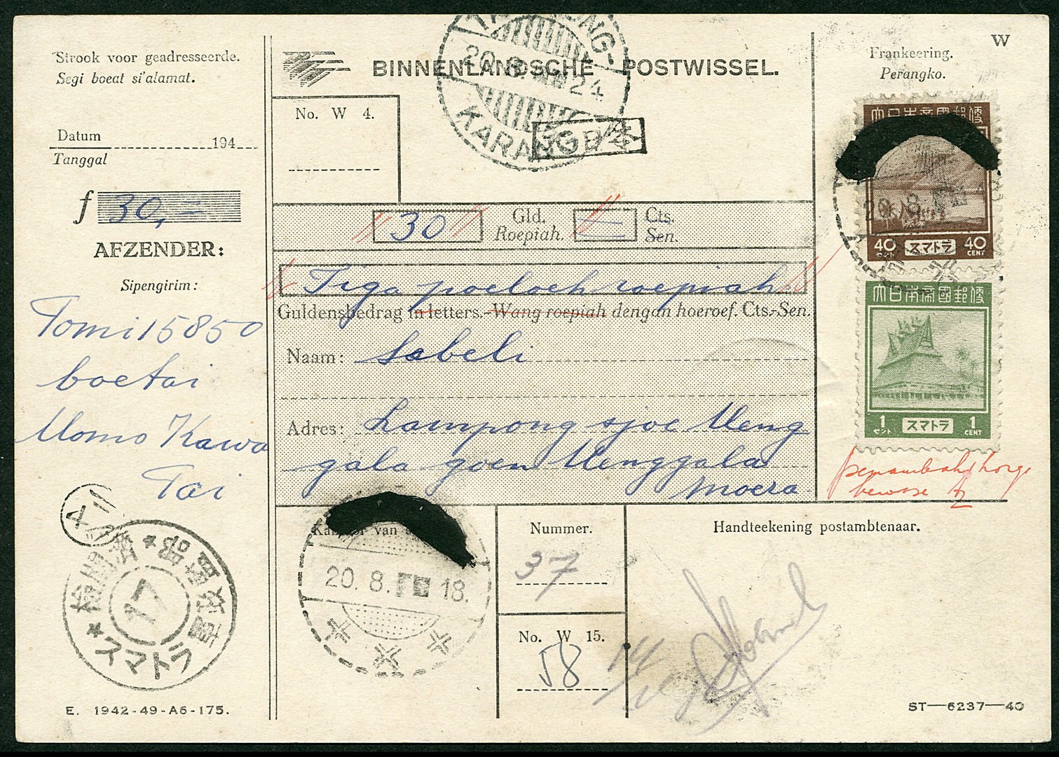 Djambi. 1 Cent (cost of the form) and 40 cent definitives nos. 001 and 010 on complete M.O. Bu.JF1a showing framed Dai Ni Hon overprint 82z from Djambi 20.8.18 (type 050, name erased) via Tandjong- / Karang 20.8.24 to Menggala 20.9.5. Censor Vr.207 with number 17 from Djambi, and on the back an unrecorded framed censor mark 'Telah Diperiksa / ...'. Interesting, also because of the date