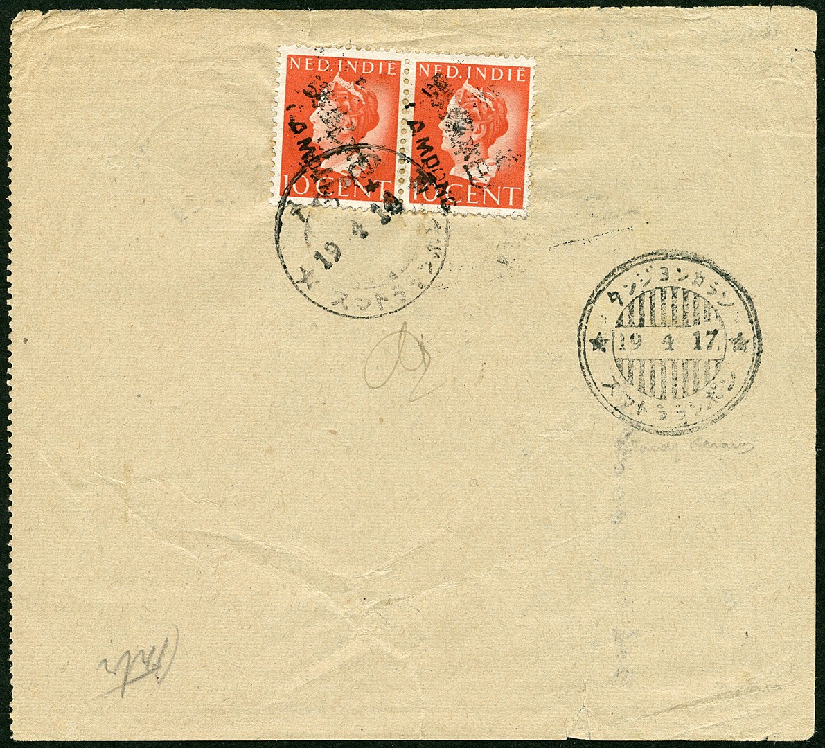 Five Application forms for M.O. transfer Bu.JF6, all bearing 10 cent van Konijnenburg nos. 824z-43" (Moearaenim 19.3.4.10), 824z-43" (2x, Palembang 19.3.2.10), 825z-43" (Pagaralam 19.3.4.18), 824z-43'bg + 43'bg (Palembang 19.3.6.11, both stamps are not perfect) and 612z-43'bg (Metro 19.4.14)