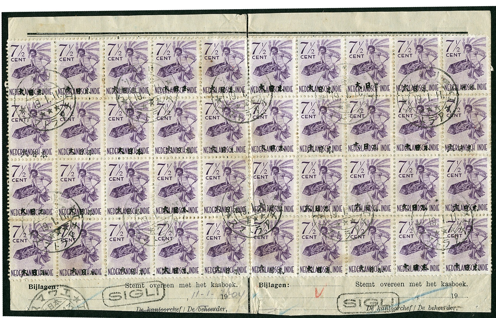 7½ Cent dancer with Dai Ni Hon overprint no. 812z-71 (40x) on Telegraphic Money Order Account Bu.JF7a, cancelled Sigli 19.1.11 (type 200)
