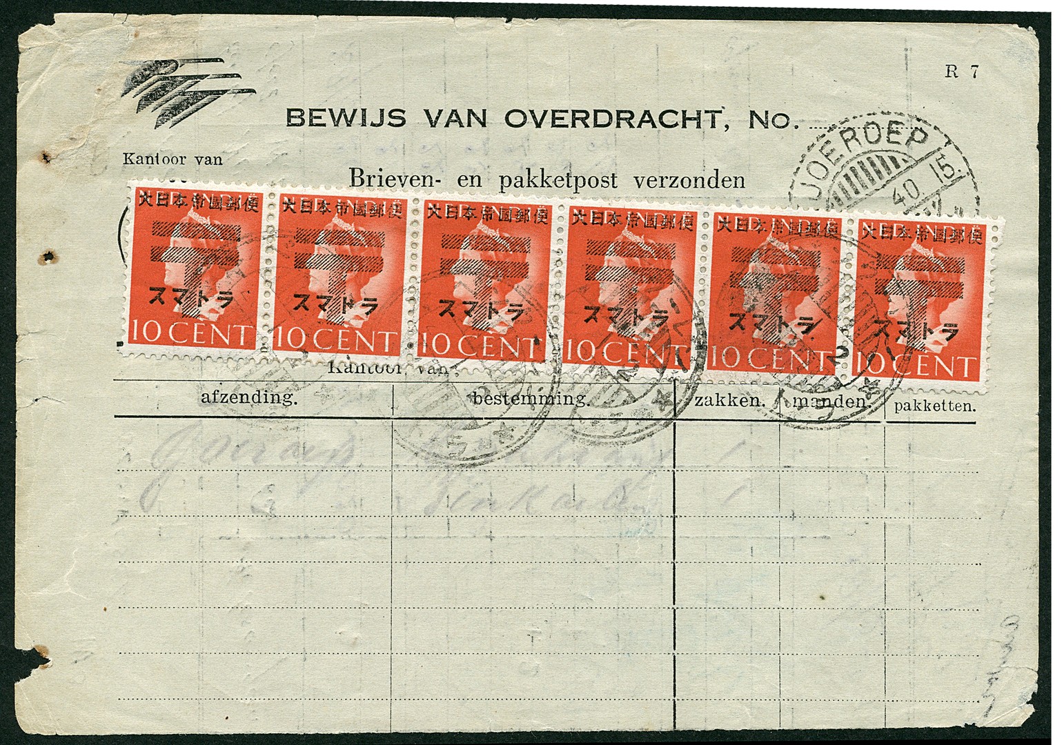 10 Cent van Konijnenburg with machine T-overprint no. 92z-43'bg in strip of six on provisionally W3 form (used is a Form No. R7, formerly cancelled Tjoeroep '40) from Tjoeroep 20.1.2 (type 220)