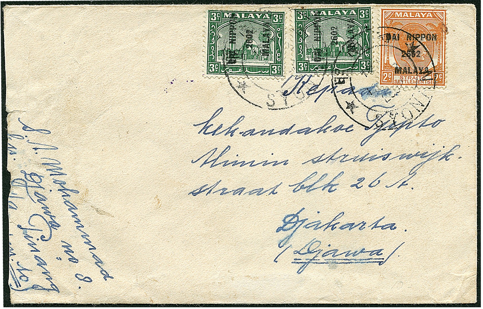 2 Cent Straits Settlements with overprint SG.J224 and 3 cents Selangor with overprint SG.J254 (2x) on cover from Singapore 17 2 2602 to a person in the Struiswijk camp in Djakarta (Java)