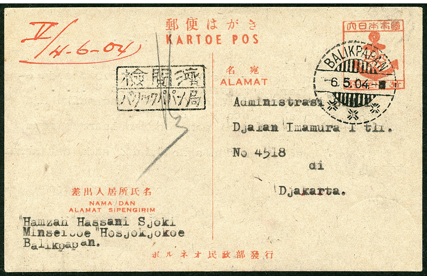 Anchor and Cherry Blossom postcard of 3½ cent Bu.229 from Balikpapan -6.5.04 to Djakarta (Java). Censor Vr.212a from Balikpapan