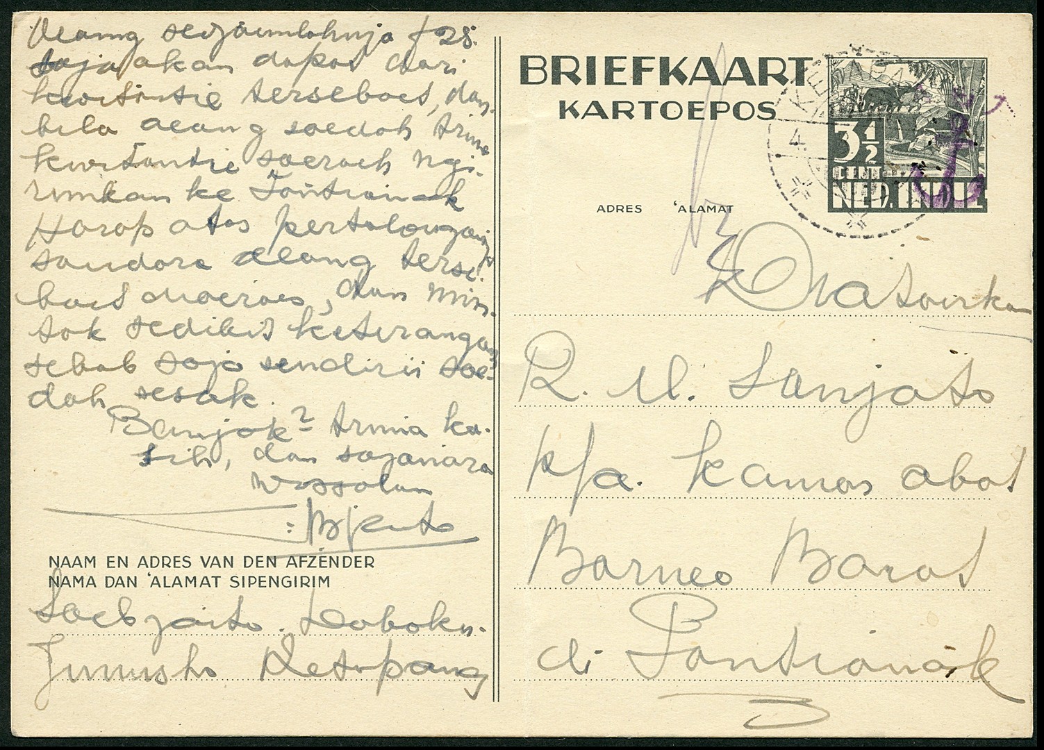 3½ Cent postcard with large anchor overprint Bu.208a (not disturbing vertical crease) from Ketapang 4.8.312 to Pontianak