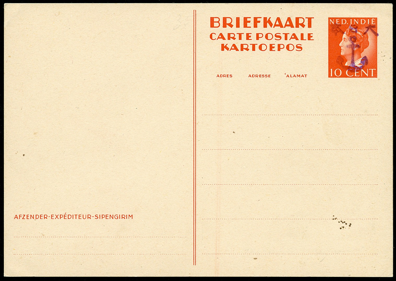 10 Cent van Konijnenburg postcard with large anchor overprint Bu.214. Fine unused copy