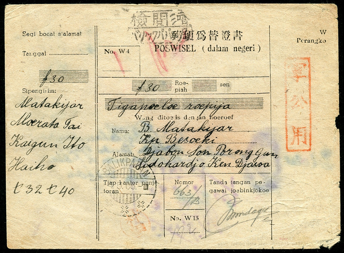 Official Military Use (3 kanji's in frame 10.5 x 42 mm) on complete M.O. Bu.JF44a from Balikpapan 4.5.05 to Sidoardjo near Porrong (Java) 28.5.05.9. Censor Vr.212a