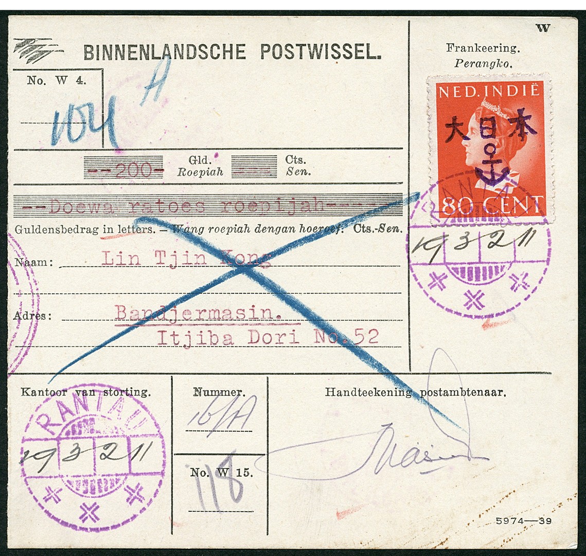 80 Cent van Konijnenburg with violet anchor overprint no. 20v-53k on M.O. Bu.JF41a from Rantau with hand-written date 19.3.2.11 (type 016) to Bandjermasin 19.3.3.-9. Superb strike of the Rantau pmk. Ex Mattern